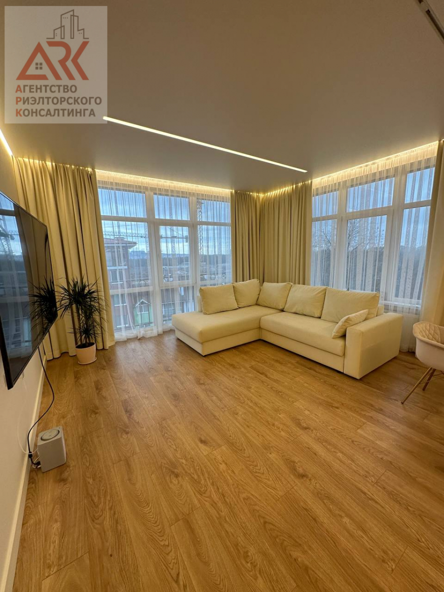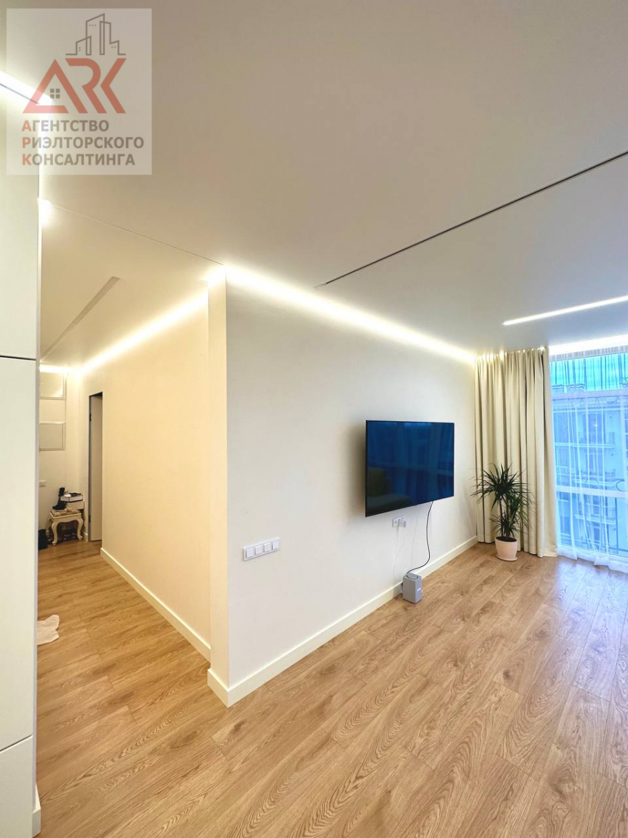 Особенность квартиры - панорамные окна в пол, открывающие потрясающий вид на город и двор, наполняя пространство естественным светом. Высокие потолки добавляют ощущение простора и свободы.